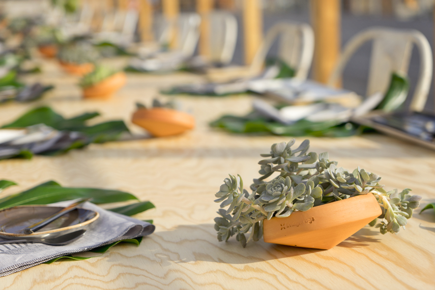 Together with the talented ladies from 79 Berlin, we styled the table top with ceramic plates and hand-stamped napkins with botanical patterns, presented on large Monstera deliciosa leaves used as natural placemats. We used Green Dots by Living Things as a “botanical table runner”: these small terracotta bowls are perfect for small grasses or crass, but also look really nice with different Echeveria succulents. They tumbled in the wind!