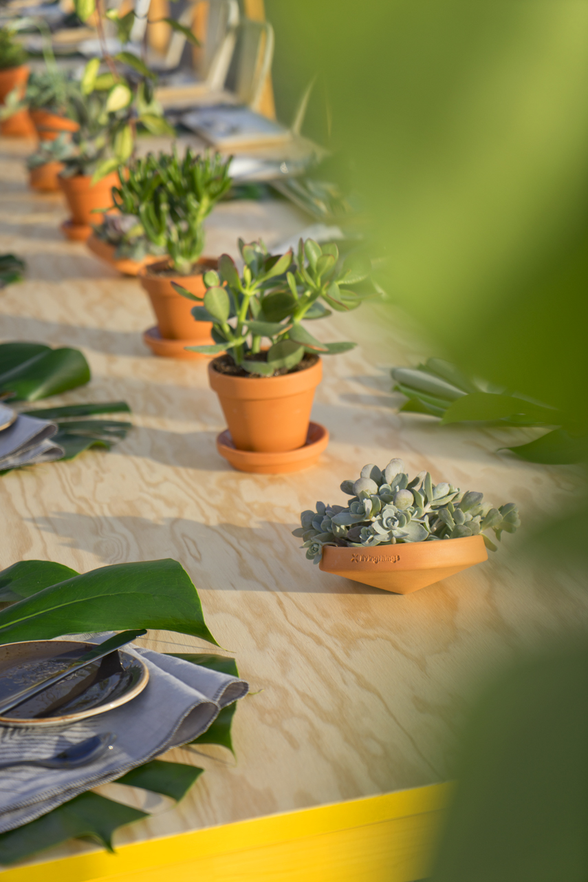 A wooden “house” structure was the base of the design, to which we attached plant hangers from fabric yarn, that we created following the DIY in the #urbanjunglebook. It was bright and sunny in Berlin when we set up the rooftop dinner, but there was so much wind that we had to cancel all the beautiful candles and Eno studio candle holders that we planned to use. No candles, but lots of greens, terracotta pots and pops of yellow made for a fun rooftop dinner location.