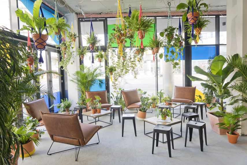 The entire Zalando Summer House identity was all about color-blocking with lots of yellow, blue and green. We opted for easy DIY plant hangers made from fabric yarn that we hung from the ceiling for an instant jungle vibe. The DIY instructions of these hangers can be found in our Urban Jungle book; one T-shirt is enough to create at least one plant hanger.