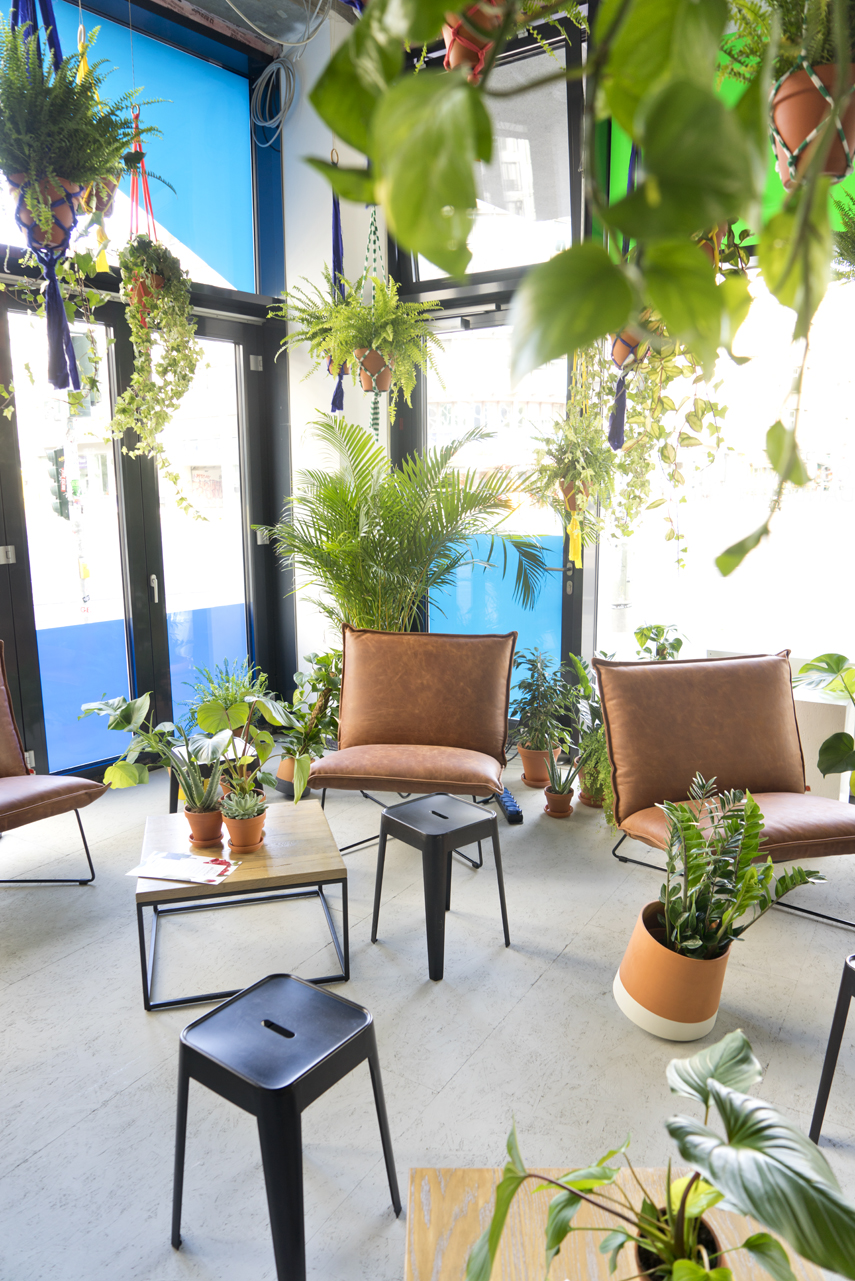 We ordered over 300 plants to create a lush urban jungle feeling and choose different kinds of ferns, ivy, palms, Monstera deliciosa, Zamioculcas, aloe plants, succulents, banana trees and ficus trees. A pretty cosy hangout, don’t you think: